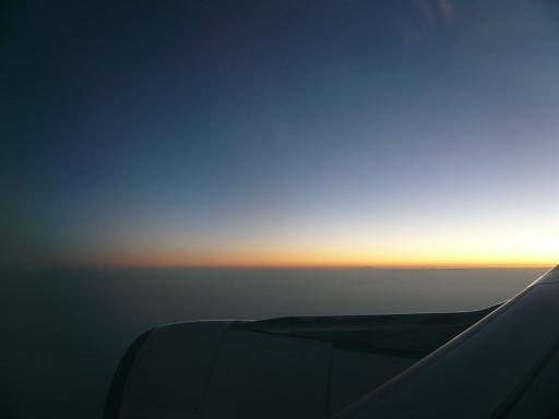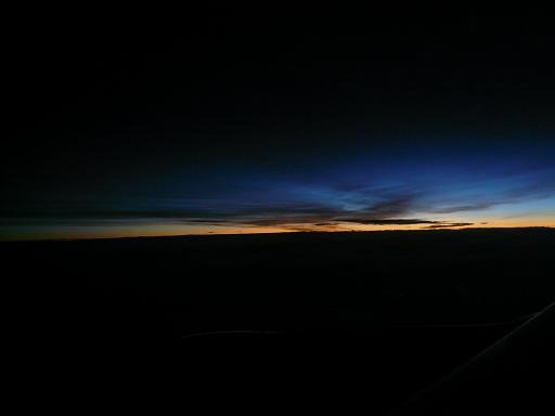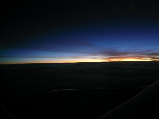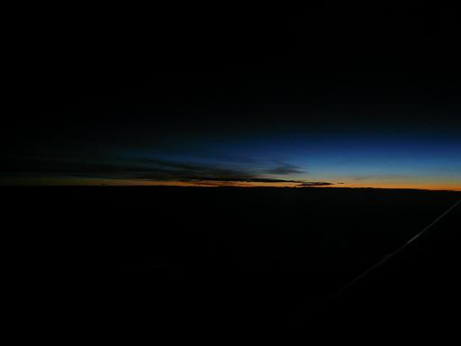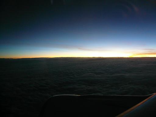 在飛機上真的很難睡得好,腰酸背痛的 不過,飛機飛得很穩,似乎沒有遇到不穩定的氣流 會被吵醒是因為前面的位置是一個外國爸爸帶著小孩 那個小孩很可愛,大概不到三歲吧 然後他就椅子上走來走去,也會哭或是說話 但是因為他太可愛了,所以就原諒他了 哈哈哈哈 也因為被吵醒了,才能拍到日出的照片 第一次在飛機上看日出,感覺很特別